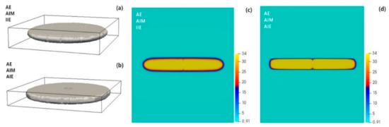 Three-dimensional view and 2D-cross section of a single θ′ precipitate with (a,c) AE, AIM and IIE conditions and (b,d) AE, AIM and AIE conditions in Al-1.69 at.% Cu alloy annealed at 453 K for t = 100,000 s. Here a 100 × 100 × 100 domain with grid spacing of ∆x = 0.7 is used.