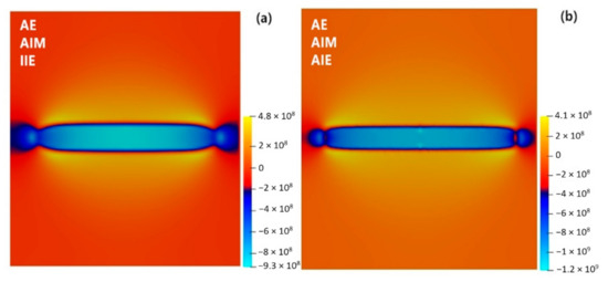 Stress (σxx) distribution around the θ′ precipitate with (a) AE, AIM and IIE conditions and (b) AE, AIM and AIE conditions in Al-1.69 at.% Cu alloy annealed at 453 K for t = 100,000 s.