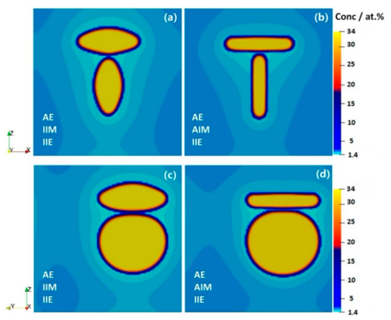 2D-cross section of phase-field simulated concentration fields of two perpendicular precipitates with (a,c) AE, IIM and IIE conditions and (b,d) AE, AIM and IIE conditions in Al-1.69 at.% Cu alloy annealed at 453 K for t = 15,000 s, along different directions. Here a 100 × 100 × 100 domain with grid spacing of ∆x = 0.7 is used.