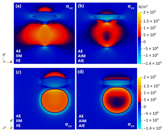 Two-dimensional-cross section of phase-field simulated stress (σxx) profiles of two perpendicular precipitates with (a,c) AE, IIM and IIE conditions and (b,d) AE, AIM and AIE conditions in Al-1.69 at.% Cu alloy annealed at 453 K for t = 15,000 s, along different directions. Here a 100 × 100 × 100 domain with grid spacing of ∆x = 0.7 is used.