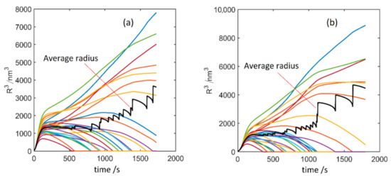 Evolution of θ′ precipitates; (a) without; and (b) with the chemo-mechanical coupling effect. In contrast to the spherical δ′ precipitates in Al-Li (Figure 3 in Ref. [10]), the coupling has almost no effect on the θ′ ripening. The colored lines associate with the individual θ′ precipitates in the simulation box.