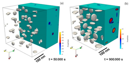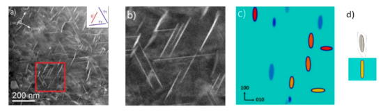 The simulated and experimental results are compared in Figure 13. Compared to our previous study [48], the morphology of the precipitates is closer to the experiment. There are still differences which are due to the resolution in the simulation domain. We found that the grid spacing ∆x has a major effect on the aspect ratio; the smaller ∆x gives more realistic results closer to the experimental observation. The simulation for a single precipitate with 70 × 70 × 70 nm3 domain with fine grid spacing of ∆x = 0.7 nm is shown in Figure 14d for comparison. To consider such a fine grid spacing in considering large simulation domain with statistically significant number of precipitates requires much larger computational capacity.