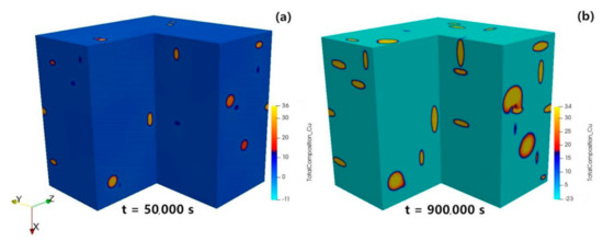 3D large scale phase-field simulated concentration evolution of θ′ precipitation process in Al-1.69 at.% Cu alloy annealed at 453 K: (a) Aging time step = 50,000 s; (b) aging time step = 900,000 s.