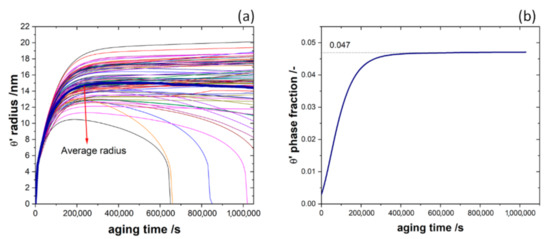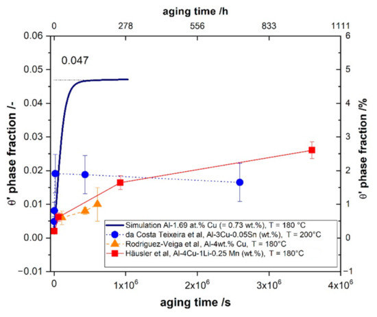 Figure 14a shows that some smaller precipitates shrink/disappear and competitive ripening is initiated slowly. The average precipitate radius of the 82 precipitates, highlighted by the thicker line, increases over time. A comparison between experimental and simulation results is shown in Figure 15. Here, the volume fraction of the θ′ phase from both simulation (continuous blue line) and experiment is plotted vs. time. The early growth kinetics agree well but the evolution of the precipitates in the experiment is suppressed in the later stages. The red full squares represent our experimental data [17,58,63] with a newly calculated value for 1 h as described in Section 4. Our experimental data (red curve) agree well with data from Rodriguez-Veiga et al. [63] at the same aging temperature (orange triangles). Data from da Costa Teixeira et al. [17] (blue full circles) shows a higher fraction for shorter aging times, which might be due to the higher aging temperature of 200 °C.