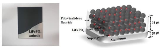 Figure 1 and Table 1 show the schematic and detailed information of the LiFePO4 cathode used in experiments, respectively. The slurry for LiFePO4 cathodes consists of 80 wt% LiFePO4, 10 wt% super P, and 10 wt% polyvinylidene fluoride. The slurry is coated on the aluminum foil, which has a 20 μm thickness. The slurry-coated aluminum foil is dried in an oven at 120 °C for 2 h. After the first drying, the electrodes are compressed by approximately 20%. Next, the second drying of electrodes is carried out at 120 °C for 24 h. The LiFePO4 cathode has a thickness of 94 (active material of 74 μm, current collector of 20 μm). The electrode-manufacturing process is carried out in a dry room with a dew point of 40 °C and temperature of 20 °C.