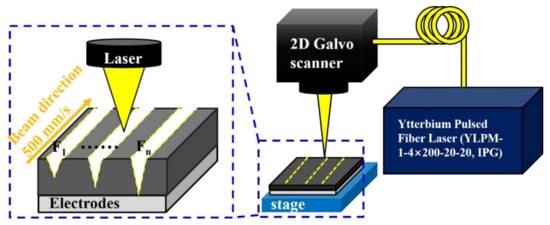 Figure 2 shows the schematic of the system for the laser structuring of electrodes. The laser parameter used in experiments is summarized in Table 2. The ytterbium pulsed fiber laser (YLPM-1-4×200-20-20, IPG photonics, Southbridge, MA, USA) used in the structuring of the electrode has a wavelength of 1064 nm. The laser can control various parameters such as fluence, pulse duration, repetition rate, scanning speed, and the number of passes. However, only the fluence and the number of passes are controlled in this experiment. Accordingly, the pulse duration, repetition rate, and scanning speed are fixed at 4 ns, 500 kHz, and 500 mm/s, respectively. The range of the fluence is 0.28 J/cm2 to 5.38 J/cm2, and the number of passes is one pass to four passes. Pulse overlap is 96.67% and can be calculated by Equation (1).