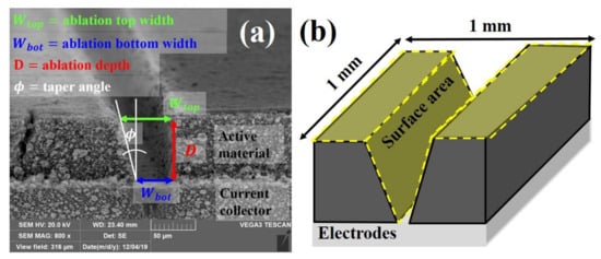 Figure 3a is obtained by SEM (TESCAN VEGA3, Brno, Czech Republic) after laser structuring. The ablation top width , ablation bottom width , ablation depth , and taper angle are defined in order to investigate the morphology of grooves depending on laser parameters. , , , and represent the dimensions of the groove on active material removed by a laser beam. In Figure 3b, the surface area is defined as the total area of the exposed surface within an area of 1 on the surface. The surface area can be calculated by Equation (2).