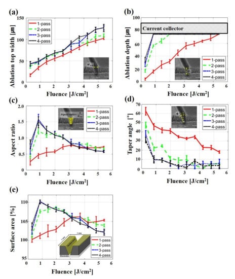 In Figure 5, the effect of the number of passes on laser structuring of 3D electrodes is analyzed at fluences of 0.86 and 5.38 which are relatively low and high fluences, respectively. As can be seen in Figure 5a, with the fluence of 0.86 , the three passes are required to completely remove active material with a thickness of 76 . As the number of passes increases at the fluence of 0.86 , the variation of is 12.4 (from one to two passes), 0.5 (from two to three passes), and 2.0 (from three to four passes). On the other hand, the variation of is 40.2 (from one to two passes), 17.7 (from two to three passes), and 0 (from three to four passes). Namely, when the number of passes increases, the is more influenced by the laser scan than until the active material is completely removed. Therefore, it can be assumed that a groove with a higher aspect ratio can be easily achieved by low fluence and multi-pass.