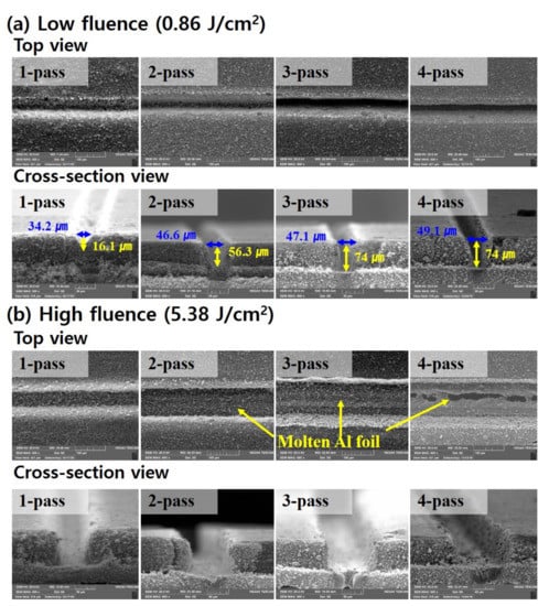 In Figure 5b, the active material is completely removed by one scan with 5.38 . However, the aspect ratio of the groove is relatively low except for one pass at the same laser fluence. Furthermore, the molten aluminum is observed at two and three passes. In particular, the electrodes are partially cut at four passes. These results are related to the ablation threshold of the aluminum foil. The ablation threshold means that the minimum energy per unit surface is required to induce detectable changes in materials []. Previous researchers reported that the ablation threshold of aluminum foil was 4.0~5.2 at a pulse duration of 4.5~5.0 ns with a wavelength of 1064 nm [,]. Based on the reported ablation threshold, it can be assumed that after active material is completely removed with one pass, the aluminum foil is melted by the laser beam of extra passeswhich laser fluence is higher than the ablation threshold of the aluminum foil. In the event of such damage to the aluminum foil, multi-pass should be avoided at a relatively high fluence such as 5.38 because it may reduce the battery performance due to molten aluminum contaminants [].