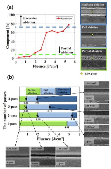 Figure 6a shows the variation of an aluminum component in partial ablation, full ablation, and excessive ablation. Energy-dispersive X-ray (EDX) analysis is conducted on structured electrodes with two passes. The aluminum component is detected on grooves that are formed by a laser. In the partial ablation region, the aluminum component increases gradually from 2.75% to 4.95% as the fluence increases from 0.28 to 1.41 . This is because when the electrodes are irradiated with higher fluence, a deeper groove is formed. The aluminum component is detected as approximately 13.55~63.59% in a full ablation region of 1.98 ~4.81 and the excessive ablation region is detected in over 77.04% of the aluminum component. When the pure aluminum foil is used for EDX analysis, the aluminum component is approximately 98.7%. These results implied that LiFePO4 is not completely removed and residues are present after laser structuring.