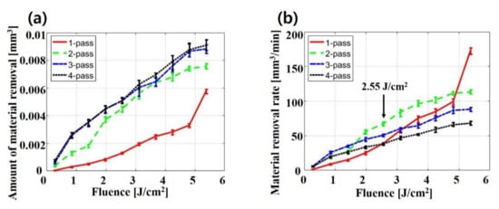 In Figure 7b, the MRR increases as the fluence increases at all passes. In addition, the effect of the number of passes on the MRR is significantly different depending on the fluence. When the fluence is less than 2.55 , the MRR of multi-pass is higher than that of one pass. However, when the fluence is over 2.55 , the MRR of one pass rapdly increases so that one pass is eventually the highest at a fluence of 5.38 . These results may be because ablation efficiency per pass increases due to the heat accumulation effect until the active material is completely removed at each number of passes. On the contrary, after the active material is fully removed with multi-pass, the ablation efficiency of multi-pass decreases because of an extra pass. In addition, if the total energy is defined as fluence × the number of passes, the total energy at which the active material begins to be completely removed is 4.81 for one pass, 3.96 for two passes, 2.55 for three passes, and 3.40 for four passes. In terms of total energy, multi-pass is also more efficient to completely remove active material because less total energy is needed.