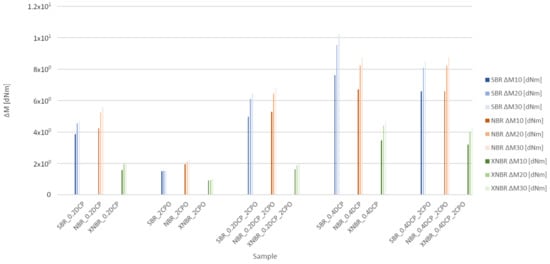 Vulcametric torque increase (ΔM) for the compounds studied at 10, 20 and 30 min from the beginning of vulcanization.