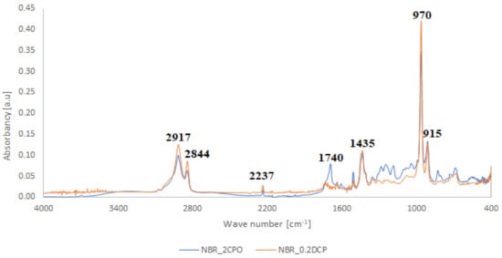Comparison between the FTIR spectra of NBR crosslinked with CPO oligomer (NBR_2CPO) and DCP (NBR_0.2DCP).