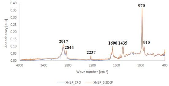 Comparison between FTIR spectra illustrating the way of crosslinking of XNBR with CPO oligomer (XNBR_2CPO) and DCP (XNBR_0.2DCP).