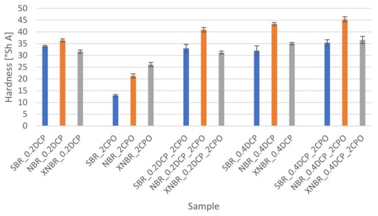 The addition of the oligomeric peroxide with functional groups (CPO) to the rubbers tested, especially in combination with the organic peroxide, causes a slight hardening of the samples, most evident in the case of those ones based on SBR. In turn, the use of the oligomer alone reduces rubber hardness, especially SBR and NBR, indicating on a plasticizing effect of CPO. In the systems based on XNBR, the observed changes to the rubber hardness, as a result of the modification of the crosslinking system composition, are the lowest among the rubber samples tested.