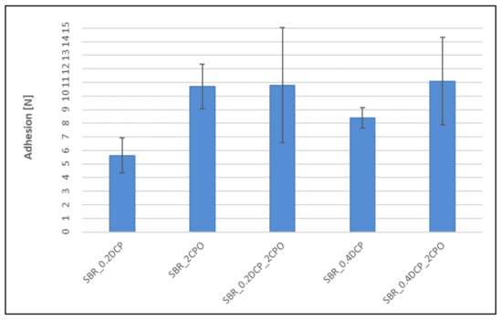 The addition of CPO to the peroxide rubber compounds, despite influencing crosslinking, increases adhesion between SBR-based vulcanizates and silver wires. As expected, the carboxyl group-containing peroxide oligomer significantly improves the adhesion. In each case, taking into account the mechanical strength of rubbers (Table 3 and Table 4), a cohesive destruction of the connection should be expected. Even the use of CPO alone (without DCP) results in a significant increase in adhesion compared to relatively high adhesion for a sample crosslinked with 0.2 phr of DCP. For NBR vulcanizates, no measurable adhesion is observed, neither for mixed systems (peroxide/CPO oligomer) nor for the sample crosslinked with 0.4 phr of DCP. On the other hand, the addition of CPO alone, without peroxide, strongly improves the adhesion to silver wires, just like for SBR-based samples. The matter of the adhesion of silver wires to the peroxide-cured XNBR looks similar to the SBR case, except that the improvement obtained is much smaller. The exception confirming the rule is a XNBR/0.4DCP/2CPO system, in which the measured adhesion force is the highest among all the crosslinked samples tested. This may be due to the fact that the CPO modifier, like XNBR, contains carboxyl groups, which give it a good affinity for the rubber, manifesting itself by a significant strengthening of the adhesion force and the overall improvement of the physical properties of the rubber samples.