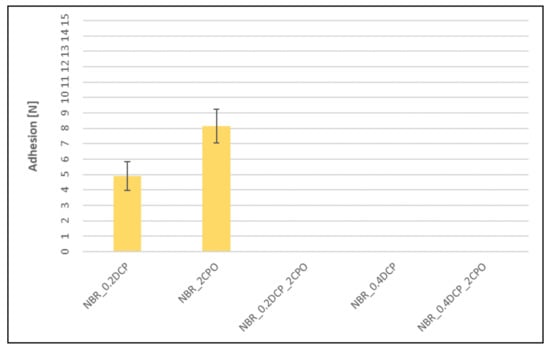 Influence of the peroxide curing system modification on adhesion between peroxide NBR vulcanizates and silver wires (missing bars indicate the lack of adhesion).
