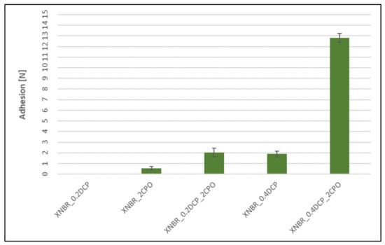 Another parameter, in addition to the presence of functional groups, responsible for the modified rubber—silver adhesion is the degree of the rubber matrix crosslinking. A silver rod is easily pulled-out from a low crosslinked rubber, that residues remain attached to the metal surface. The strong chemical adhesion manifests itself for a highly crosslinked rubber, which explains the highest adhesion determined for XNBR_0.4 DCP_2CPO. The absence of measurable adhesion between a silver rod and highly crosslinked NBRs is most likely a physical effect, associated with the different thermal shrinkage of the metal and the rubber after vulcanization.