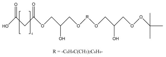 Thirty grams (30 g) of monoperoxy derivative of epoxy resin (PO) [] dissolved in 150 mL of isopropanol, 3.7 g of benzyl triethylammonium chloride dissolved in 3.3 mL of water and 12.0 g of adipic acid dissolved in 50 mL of isopropanol were placed in the reactor. The reaction mass was sustained at 60 °C under stirring for 20 h. Then, 150 mL of toluene was added, and the mixture was carried into the dividing funnel. The bottom layer was not used, whereas the upper one was washed by water until all the catalyst was removed. The organic layer was then transferred to a vacuum distillation unit. Vacuum distillation was carried out at 50 °C and a residual pressure of 133–266 Pa to constant weight. In this way, 39.6 g of CPO oligomer of 560 g/mol molecular weight, with 2.0% of active oxygen and 8.8% of carboxyl groups content was obtained. The product did not have any epoxy groups. Their absence was confirmed by two methods: chemical and spectral. Chemical method: the epoxy number was determined using the back titration of hydrochloric acid acetone solution by 0.1 N alkali solution []. Spectral method: the absence of absorption bands at 910 cm−1 (typical of epoxy ring stretching vibrations) in the FTIR spectrum of CPO. Physical properties of the resin are presented in our previous paper [].
