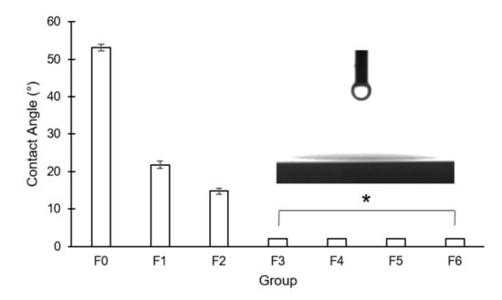Measurement of contact angles of the experimental groups (F0–F6) (*: The values were less than 10°, indicating their hydrophilic properties).