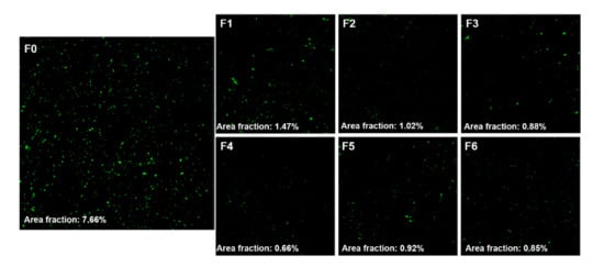 The area fraction of fluorescence, which represented the viability of S. mutans, observed with CLSM was the highest in F0 (7.66%), and it decreased to 1.47% (F1), 1.02% (F2), 0.88% (F3), 0.66% (F4), 0.92% (F5), and 0.85% (F6). Its decrease was visualized as a series of fluorescence images (Figure 4).