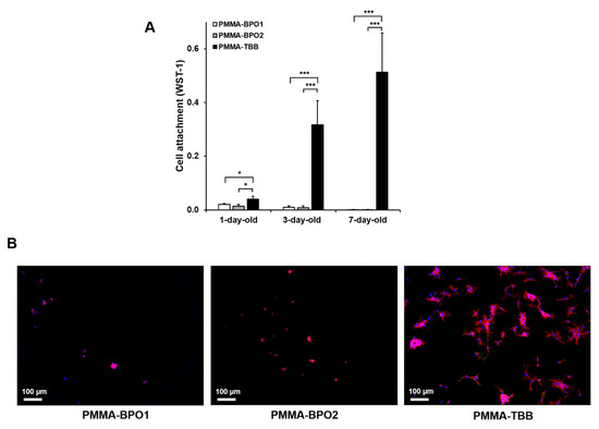 The number of osteoblasts surviving and attaching to three different bone cements was evaluated using the WST-1 assay after two days of culture (Figure 1A). The number of osteoblasts attaching to PMMA-TBB was significantly greater than those attaching both PMMA-BPO cements, regardless of their age. Of note, there was a significant increase in cell attachment on three-day-old and seven-day-old PMMA-TBB compared to one-day-old PMMA-TBB (p < 0.01). Fluorescent microscopy of cells on seven-day-old bone cements confirmed a greater number of cells attached to PMMA-TBB (Figure 1B).
