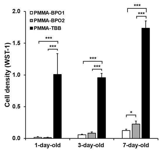 Cell proliferation was evaluated by measuring WST-1 values after five days of culture (Figure 3). In contrast to the day two culture values, more cells were present on all three bone cements as they aged. Similar to the day two cell attachment results, cell density was considerably higher on PMMA-TBB than on both PMMA-BPO cements, regardless of age, and even on one-day-old material.