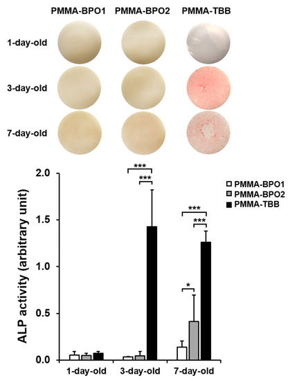 Matrix calcium deposition mirrored the ALP activity (Figure 5). Calcium deposition was consistently higher on PMMA-TBB cement than PMMA-BPO cements regardless of age, and calcium deposition on one-day-old PMMA-TBB was equivalent to that on seven-day-old PMMA-BPO cements. Similar to the result of ALP activity, a major increase was found between one-day-old and three-day-old PMMA-TBB cements (p < 0.01) and between thee-day-old and seven-day-old PMMA-BPO cements (p < 0.05). The colored images of Alizarin red staining re-affirmed the superior calcium deposition on PMMA-TBB cements (Figure 5).