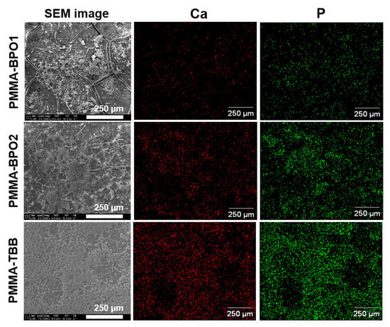 The cultured matrix was also examined by SEM and EDX (Figure 6). Biological structures were found extensively on PMMA-TBB cements compared with PMMA-BPO cements in the SEM images. Cultures on PMMA-BPO bone cements tended to exhibit bare bone cement surfaces without biological structures. The biological structures on PMMA-TBB showed intense Ca and P signals, indicative of a mineralized matrix.