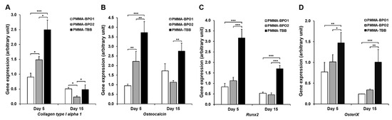 The expression levels of osteoblastic genes, collagen type 1 (A), osteocalcin (B), runx2 (C), and osterix (D), quantified by real-time PCR on days 5 and 15 of culture. Osteoblasts were cultured on seven-day-old bone cement specimens. Data are shown as mean ± SD (n = 3). Statistical differences between the three groups are shown (one-way ANOVA followed by Bonferroni test, * p < 0.05, ** p < 0.01, *** p < 0.001).