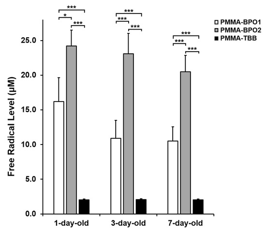 ESR analysis revealed significantly less polymerization free radical production from PMMA-TBB cements compared to PMMA-BPO cements, regardless of their age (Figure 8). Free radical levels were consistently low from one-day-old to seven-day-old PMMA-TBB specimens. By contrast, free radical levels were highest for one-day-old specimens, and maintained high even for seven-day-old specimens in PMMA-BPO cements. Of note, even in seven-day-old specimens, PMMA-TBB showed a substantially lower radical production than PMMA-BPO cements.
