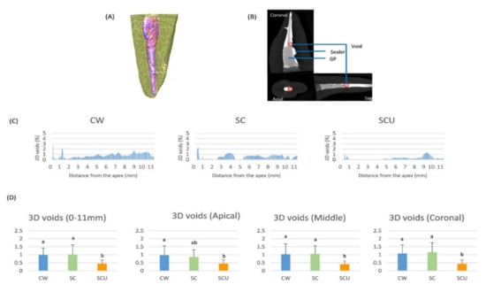 - Wolf, M.; Kupper, K.; Reimann, S.; Bourauel, C.; Frentzen, M. 3D analyses of interface voids in root canals filled with different sealer materials in combination with warm gutta-percha technique. Clin. Oral Investig. 2014, 18, 155–161. [Google Scholar] [CrossRef]