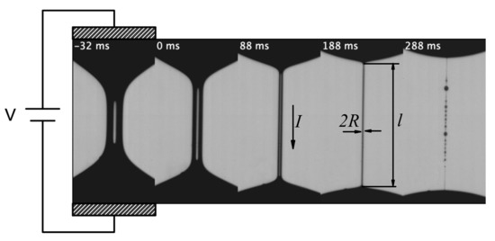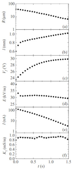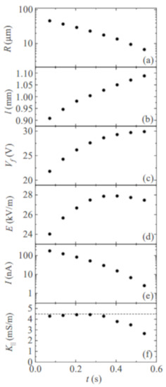 Figure 4 shows the filament radius R and length ℓ, voltage drop across the filament , electric field , electric current I, and the conductivity as a function of time during the breakup of a liquid bridge of PEO8M 0.5%. The electrical resistance of the resistor and liquid filament are commensurate with each other during the initial phase of the elasto-capillary regime. For this reason, the voltage drop across the filament significantly increases in that phase. As can be observed, the electrical conductivity is essentially independent of the instantaneous voltage drop. The filament length increases as the radius decreases. This effect partially compensates for the increase of , and thus the electric field remains practically constant. In the last stage of the elasto-capillary regime, the free surface shrinks at the filament ends, which may significantly reduce the electric current. This deviation from the cylindrical shape assumed in Equation (1) does not allow us to measure accurately the electrical conductivity for –10 m. Determining quantitatively the influence of the filament end shrinkage on the electric current would require the accurate measurement of the filament radius over the whole filament, which is not possible owing to the disparity between the radial and axial length scales.