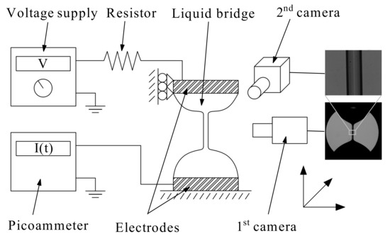 A direct current (DC) voltage drop was set between the upper and lower (grounded) disks using a power voltage supply (HQ Power PS3003, Weifang, China, 0–30 V). The electric potential was applied during the last phase of the liquid bridge quasi-static stretching to avoid the liquid heating produced by the Joule effect. In addition, a resistor of resistance M was connected in series with the liquid bridge. This element reduces the electric current crossing the circuit before the elasto-capillary regime is reached. The electric current was measured with a picoammeter (Keithley model 6485, Cleveland, OH, USA).