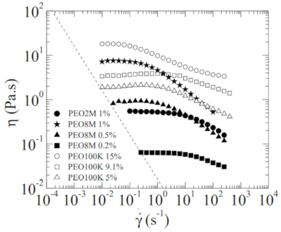The density of the tested fluids was measured with a pycnometer of mL and a precision balance. The surface tension was measured with the Theoretical Interface Fitting Analysis (TIFA) method [25]. The extensional relaxation time was determined from the experiments because the mechanical effect of the electric field was negligible. The hydrostatic electrical conductivity was measured by applying a voltage difference between the ends of a borosilicate capillary filled with the tested liquid. The value of was determined from the slope of the linear relationship between the applied voltage and measured electric current. Table 1 shows the properties of the tested liquids. A stress-controlled rotational rheometer (Discovery HR-2, TA Instruments, New Castle, UK) was used to measure the steady shear viscosity as a function of the shear rate of the fluid samples (Figure 3). We used a plate-plate geometry of 20 mm in radius and a gap of 1 mm. The temperature within the fluid volume was set to 20 C, and was controlled by a Peltier element. The zero-shear viscosity of the bidisperse solutions significantly increases when PEO100K is added to the solution PEO8M 0.5%. As will be shown in Section 2, this allows the filament to stretch down to m while keeping its quasi-cylindrical shape. The extensional relaxation time of the bidisperse solutions is significantly smaller than that of PEO8M 0.5% probably due to the interaction between polymers. This suggests that dissolved polymers with g/mol do not properly stretch in the presence of those with g/mol.