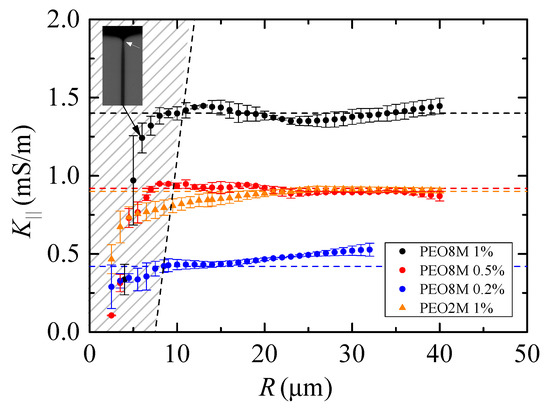 The results for the electrical conductivity of the monodisperse polymeric solutions are shown in Figure 5. The wavy shape of is probably due to the criterion adopted to determine the filament length ℓ, which may produce small spurious variations of that quantity. The main conclusion is that the electrical conductivity is practically the same as that measured under hydrostatic conditions (Table 1) even though the dissolved polymers are highly stretched in the elasto-capillary regime. Unfortunately, and as mentioned above, we cannot obtain reliable results for m (the stripped area in Figure 5) because the filament shape deviates from the cylinder as R decreases below those values. Therefore, we cannot determine to what extent the decrease of as calculated from (1) can be attributed to a true reduction of the liquid conductivity.