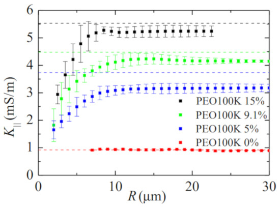In the second set of experiments, we measured the conductivity of bidisperse solutions of PEO with very different molecular weights. For the sake of illustration, Figure 6 shows the time evolution of the quantities of interest in a single experiment with PEO100K 9.1%. The extensional relaxation time characterizing the elasto-capillary regime is essentially determined by the polymer with the highest molecular weight. This means that the polymer molecules with the lowest molecular weight do not undergo the coil-to-stretch transition, and, therefore, they remain in their coiling state. As can be observed in Figure 7, the liquid conductivity considerably decreases as the filament radius decreases below around 7 m. This effect becomes more noticeable as the concentration of PEO100K increases. As shown in Figure 8, this reduction of the electrical conductivity cannot be attributed to deviations of the filament shape from the cylindrical shape assumed in our calculations. In fact, the shrinkage of the filament ends takes place for m probably due to the higher solution shear viscosity (Table 1). There are small differences between the value of and for large R when PEO100K is added to the solution. This is probably due to the early orientation of the polymer molecules in the axial direction as soon as a filament begins to form. We cannot ascertain if the reduction of the solution conductivity in Figure 8 for small radii is caused exclusively by the presence of coiled polymer molecules in the filament. It is also possible that the bigger polymers contribute to the reduction of the electrical conductivity, as suggested by the results in Figure 5.