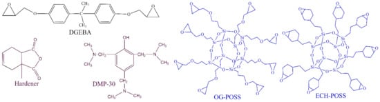 The fabrication process has been represented in Figure 1. First, DGEBA, POSS, and MeTHPA were kept at 60 °C for two days before blending to avoid bubbles and potential voids. POSS fillers were added into the curing agent MeTHPA (GH-9303, 1.21 g/cm3), and IKA T25 high-speed shearing machine was used to mix the liquid for 15 min with 5200 rpm speed. Then, the liquid is degassed and de-foamed by THINKY mixing machine for 30 min. To ensure the homogenous dispersion of POSS fillers into curing agent, sonication was performed for 15 min at 50 °C using an ultrasonic device of 99W power. Then, the DGEBA (ρ = 1.03 g/cm3) and DMP-30 accelerator was blended with the liquid. The same stirring and de-foaming procedures were repeated. Steel molds were cleaned by ethanol and kept in a kiln at 60 °C for 2 h before the liquid was cast into the different shapes and sizes of molds. An anti-setting agent was applied on the surface of molds to ensure an easy detachment of backed specimens. The mixed liquid was cured for 4 h at 80 °C and then for 8 h at 120 °C. The samples were then cooled to room temperature using an annealing process to get an adequately cured sample and to avoid cracks. The samples were cleaned with ethanol and then kept at 60 °C for 12 h before the experiments were carried out. A typical stoichiometric ratio for Epoxy, MeTHPA, POSS, and DMP30 was set as 100:80:2.5:1. POSS was added with a filler loading of 2.5 wt.% as an optimal value reported in Reference []. The chemical structure of DGEBA, MeTHPA, DMP-30, ECH-POSS, and OG-POSS is shown in Figure 2.