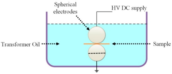 With growing direct current high voltage (HVDC) applications, insulation failure has attracted much attention for epoxy-based insulating equipment to ensure power system reliability []. Hence, it is significant to explore the breakdown mechanism and improve the electrical performance of epoxy resin. In recent years, nanoparticle incorporation, which introduces a vast interfacial region between nanoparticles and polymer matrix, has attracted great attention in the insulation domain [,]. The interfacial region that occupies a large volume of nanocomposites can determine the dielectric strength []. Therefore, the breakdown performance of epoxy resin can be improved by nanoparticle incorporation, but the mechanism of breakdown relates to interfacial properties is still unclear.
