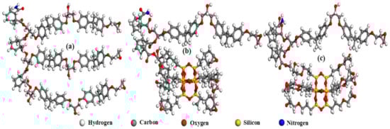 The DGEBA, MeTHPA, POSS, and DMP30 monomer molecules were constructed using Material studio software 2017 (San Diego, CA, USA) []. Based on the chemical reaction among DGEBA, hardener, and accelerator, the molecular structure of epoxy resin was built in Figure 5a. The presence of eight epoxycyclohexyl (ECH-POSS) and glycidyl (OG-POSS) side groups on the POSS core was the reason for selecting POSS as fillers for DGEBA, as shown in Figure 5b,c.
