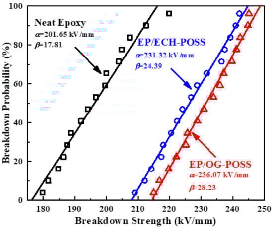 Weibull distribution plot for the breakdown test of neat epoxy, EP/ECH and EP/OG-POSS.