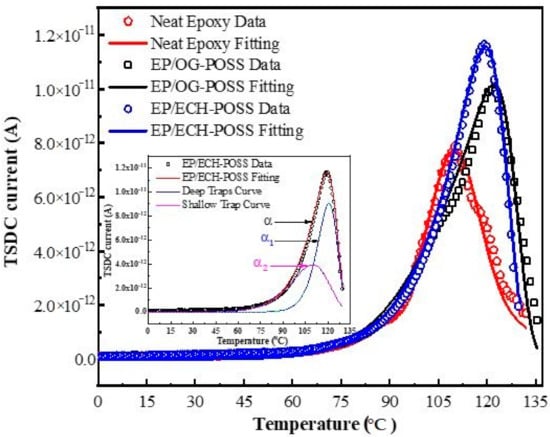 The fitting curves are consistent with experimental results in Figure 4. The α peak is characterized into two peaks, i.e., deep trap peak (α1) and shallow trap peak (α2), as shown in the inset figure of the EP/ECH-POSS sample. For epoxy/POSS composites, the trap levels are higher than that of neat epoxy. EP/OG-POSS has the highest deep trap energy of 2.15 eV. EP/ECH-POSS and neat epoxy have 2.0 eV, and 1.8 eV deep traps energy, respectively. It has been illustrated that tailoring deeper trap energy lowers the probability of trapped charges to escape. The deep trap has higher retention potency to restrain the trapped charges until some external factors are applied, such as temperature in this case is applied. Additionally, the TSDC peak for EP/OG-POSS occurs at higher temperatures. It shows that incorporating OG-POSS can form a large network of traps that restrain trapped electrons from de-trapping at earlier temperatures, as it requires external energy to escape. The neat epoxy has a smaller peak and a lower trap level (Table 2), indicating that fewer traps have been tailored; therefore, a lower peak has been observed. While the energy of shallow traps weakly links to the breakdown strength does not noticeably change for all samples (0.95 eV to 0.96 eV).