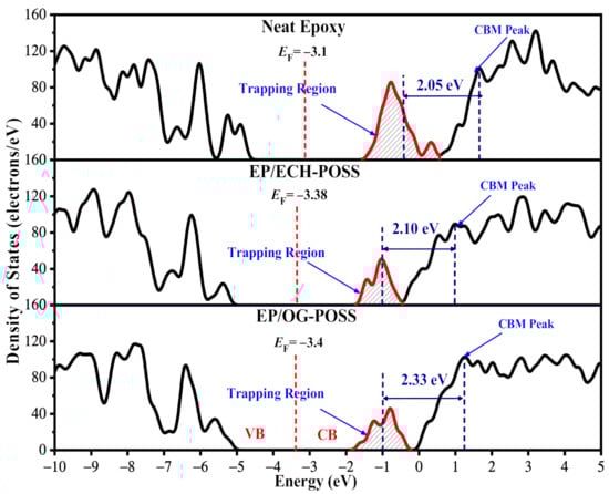 Total density of states (TDOS) of neat epoxy, EP/ECH-POSS, and EP/OG-POSS. Black line represents TDOS. EF is shown by vertical red dashed line in the mid-point of valance band (VB) and conduction band (CB). The trapping region is shaded. The first peak of CB is regarded as the CBM peak.