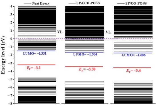 Figure 9 represents the energy level distribution of EP/ POSS nanocomposites. The lowest unoccupied molecular orbital (LUMO) and highest occupied molecular orbital (HOMO) were derived from DOS calculation. The mid-position of HOMO and LUMO is EF. The vacuum level (VL) is at the zero energy level, and the gap distance between VL and LUMO is the electron affinity (EA), which is the released energy when the composite acquires an electron and closely associated with the trapping depth in the bulk of the matrix []. For neat epoxy resin, the EA is 1.331 eV. While for EP/ECH-POSS and EP/OG-POSS, the EA is 1.504 eV and 1.606 eV, which is 0.173 eV and 0.275 eV higher than neat epoxy.