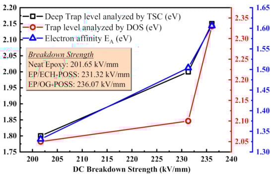 Figure 10 shows the relationship between DC breakdown strength and trap characteristics analyzed by TSDC and molecular simulation. The trap parameters have been taken from TSDC analysis, DOS calculations, and energy distribution diagram. As the deep trap level and electron affinity (EA) increase, the DC breakdown strength increases, which indicates that the trapping mechanism strongly influences the breakdown strength. DC breakdown strength has a positive relationship with the trap level, and EA is calculated from the energy distribution diagram in Figure 9. The results show that doping of the OG-POSS filler improves the trap level and EA, which eventually enhances the DC breakdown strength.