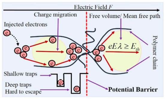 Figure 13 shows the potential barrier against the charge transport tailored in the polymer matrix. For epoxy resin, there are large areas of amorphous regions and molecular chains are easily moved in the amorphous region. In this case, free volume breakdown is a potential dielectric failure mechanism for epoxy composites at room temperature []. In the free volume approach, breakdown is triggered as the electrons are accelerated by applied field and hop over the potential barrier. In this case, the breakdown strength E is dominated by the longest free path lst, and the height of potential barrier Eth, the free volume breakdown criterion can be expressed as: