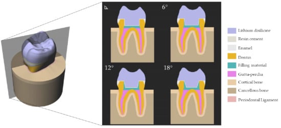 - Lin, J.; Lin, Z.; Zheng, Z. Effect of different restorative crown design and materials on stress distribution in endodontically treated molars: A finite element analysis study. BMC Oral Health 2020, 18, 226. [Google Scholar] [CrossRef] [PubMed]