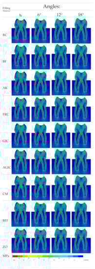 - Dikova, T.; Vasilev, T.; Hristova, V.; Panov, V. Finite element analysis in setting of fillings of V-shaped tooth defects made with glass-ionomer cement and flowable composite. Processes 2020, 8, 363. [Google Scholar] [CrossRef]