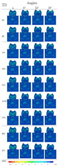 - Pai, S.; Naik, N.; Patil, V.; Kaur, J.; Awasti, S.; Nayak, N. Evaluation and comparison of stress distribution in restored cervical lesions of mandibular premolars: Three-dimensional finite element analysis. J. Int. Soc. Prev. Community Dent. 2019, 4, 605–611. [Google Scholar] [CrossRef]