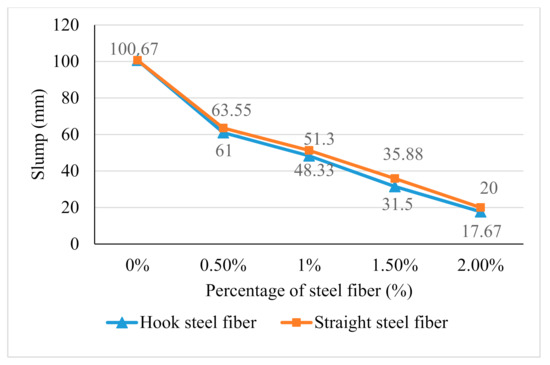 Figure 2 illustrates that the slump test result of geopolymer concrete without the addition of steel fibers was 100.67 mm. The slump of geopolymer concrete for hook steel fibers addition decreased with the increasing additions of steel fibers from 0% to 2% which are 61 mm (0.5% steel fibers), 48.33 mm (1% steel fibers), 31.5 mm (1.5% steel fibers), and 17.67 mm (2.0% steel fiber). Meanwhile, the slump of straight steel fiber had also decreased with the increasing addition of steel fibers which is 63.55 mm (0.5% steel fibers), 51.3 mm (1% steel fibers), 35.88 mm (1.5% steel fibers), and 20 mm (2.0% steel fiber). This has shown that the existence of steel fibers will reduce the workability of geopolymer concrete. The workability of concrete will significantly decrease due to the increase of resistance between the steel fibers and geopolymer matrix called interlocking as shown in Figure 3.